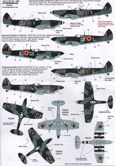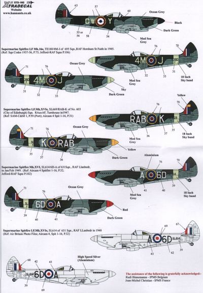 Xtradecal - 1/72 Scale Supermarine Spitfire Mk.XVIe (11) High Back SM311 DN-P 416(RCAF) Sqn B56/Evere 12/1944 Partial D-Day stripes; SM306 AU-H 421(RCAF) Sqn 'Panama Bound' 1945; TD147 JF-E Wg.Cdr Stocky Edwards Oc 127 Wing 1945; Low Back TB794 YT-S 65 Sqn Raf Bentwaters 1945; TD280 or TB702 GW-Y 340(French) Sqn/Groupe de Chasse 4/2 Germany 1945; TE180 4M-J 695 Sqn Raf Horsham St Faith 1945; SL669 RAB-K 603(City of Edinburgh) Sqn R.Aux.AF Turnhouse 1947; SL614 6D-A 631 Sqn Raf Llanbedr 2 versions 1948 camouflaged or High Speed Silver 1949; TB675 OU-V 485(RNZAF) Sqn Germany 1945; TD240 WX-V 302 Sqn 131 Wing 2 Taf Germany 1945; TB991 GE-L 349 Sqn Belgian Af 1946