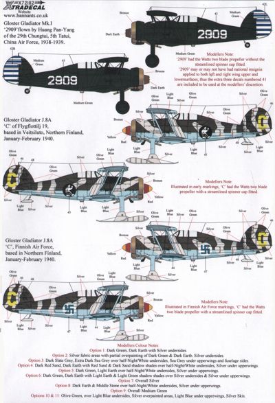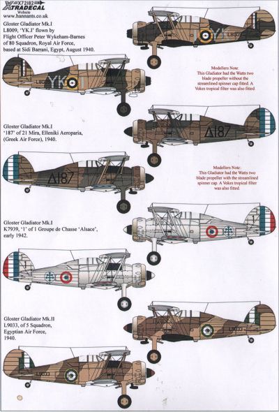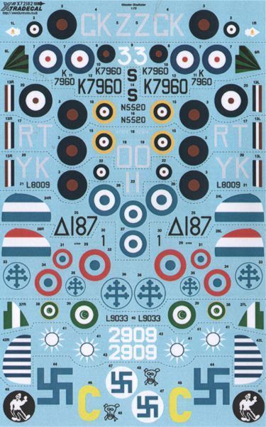 Xtradecal - 1/72 Scale Gloster Gladiator Mk.I/J.8A (10) GK-Z 80 Sqn Raf Sidi Barrani, Egypt 1940; K7960/P 3 Sqn Sqn/Ldr H.I.P.Lester Raf Kenley 1938; K7974 RT-O 112 Sqn P/O P.O.V.Green Sudan 1940; L8009 YK-I 80 Sqn F/O P.Wykeham-Barnes Egypt 1940; Greek Af No 187 21 Mira, Elleniki Aeroparia 1940; French Af K7939/1 1 Gp de Chasse Alsace 1942; Egyptian Af L9033 5 Sqn 1940; China Af 1938 2909 29th Chungtui 5th Tatui; Finnish Af Flygflottilj 19 on skis, 2 versions; Sea Gladiator N5520/S Hal Far Fighter Flight Malta 1940;