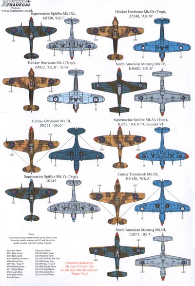 Xtradecal - 1/72 Fighters over Africa and the Mediterranean Pt.2 Hawker Hurricane Mk.I Tropical version Z4932 DL-B 'Kiwi Sub Lieutenant Michael Fell RN Libya 1940, Hurricane Mk.IIb (Trop) Z5348 AX-M 1 Sqn SAAF 1942, Hurricane Mk.IIc (Trop) HV560 FT-Z /E 43 Sqn RAF S/L M.Rook Algeria 1943, Supermarine Spitfire Mk.Vc (Trop) AX-N 'Cirecooks VI' Lieutenant M.E.S Robinson 1 Sqn SAAF Tunisia 1943, JK345 336 Sqn R.Hellenic AF Greece 1944, Spitfire Mk.IXc MJ730 GZ-? 32 Sqn RAF S/Ldr G.Silvester DFC Greece 1944, P-51B Mustang Mk.III FB271 HS-<,>, 260 Sqn RAF Italy 1945, North-American P-51D Mustang Mk.IV KH682 GN-B 249 Sqn RAF Brindisi 1944, Curtiss P-40C Tomahawk Mk.IIb BV158 WR-A 40 Sqn SAAF 1942, P-40F Kittyhawk Mk.II FS490 CV-V 3 Sqn RAAF W/Co Brian Eaton Italy 1943, P-40F Kittyhawk Mk.III FB271 OK-<,>,