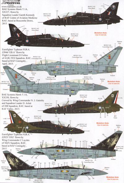 Xtradecal - 1/72 RAF/RN Update 2015 (10) Some very attractive and colourful Anniversary schemes. BAe Hawk T.1A XX240/849 Royal Navy RNAS Culdrose 2014, BAe Hawk T.1A XX327 RAF Centre of Aviation Medicine, Sqn Ldr G Kennedy RAF Boscombe Down, BAe Hawk T.1A XX350 208 Sqn WWI Anniversary Wg, Com N. J. Gatenby/Sq Ldr D. Arlett RFC green tail, RAF Valley Eurofighter Typhoon FGR.4 ZJ925/DXI XI(F) Sqn 100th Anniversary. Wg. Cdr C. Layden with black fin RAF Coningsby, Typhoon FGR.4 ZJ946 EB-A 41(R) TES Sqn Flt Lt D. Forbes RAF Coningsby standard scheme, Typhoon FGR.4 ZK344/H II(AC) Sqn Wg. Cdr R.G. Elliott RAF Lossiemouth standard scheme, Typhoon FGR.4 ZK349 GN-A 29(F) Squadron Flt Lt B. Westoby-Brooks RAF Coningsby in markings carried by Hurricane of 249 Sqn flown by Flt Lt E.J.B.Nicholson VC, the only VC in the Battle of Britain. Typhoon FGR.4 ZK353 /BQ 29(F) Sqn 100th Anniversary. Flt Lt Jonny Dowen with ruby red fin, RAF Coningsby, BAE Tornado GR.4 ZA461 XV(R) Sqn 100th Anniversary. Wg. Cdr Jon Nixon/Sqn Ldr Conan Mullineux with red fin RAF Lossiemouth, Tornado GR.4 ZA456 9 Sqn 100th Anniversary. Wg. Com I.J.Sharrocks/Flt Lt A.H.Lock black fin AF Marham,