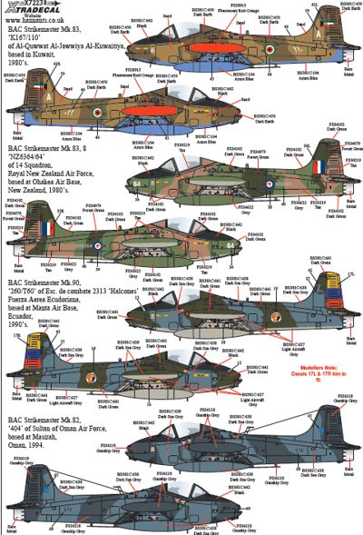 Xtradecal - 1/72 BAC Strikemaster (19) Mk.80 G-AWOS at Farnborough Air Show 1968, Mk.80A 1120 Royal Saudi AF, King Faisal Air College, Saudi Arabia 1970, Mk.80B 902/1026 Royal Saudi AF, King Faisal Air College, Saudi Arabia 1968, Mk.82 418/8 Sultan of Oman AF G-BAWF/277 at Paris Air Show 1973, Mk.82 408/8 Sultan of Oman AF Dhofar 1975, Mk.82 404 Sultan of Oman AF Masirah, Oman 1994, Mk.82 404 Sultan of Oman AF Masirah, Oman 2001, Mk.83 04/Z2 Botswan Defence Force 1990, Mk.83 K167/110 Al-Quwwat, Kuwait 1980, Mk.83 K167/120 Al-Quwwat, Kuwait G-AYVK/461 at Paris Air Show 5/6/1971, Mk.83 NZ6364/64 14 Sn R New Zealand A Ohakea Air Base 1980, Mk.83 502 FTS South Yeman AF Mk.84 301/B FTS Singapore AF, Tengah, Singapore 1972, Mk.84 301/B FTS Singapore AF, Tengah, Singapore 1980, Mk.84 303/D FTS Singapore AF, Tengah, Singapore 2001, Mk.87 601 Kenya AF 1980, Mk.89 244/T44 Esc.de Combate 2313 'Halcones', Fuerza Aerea Ecudoriana 1980, Mk.90 260/T60 Esc.de Combate 2313 'Halcones', Fuerza Aerea Ecudoriana 1990, Mk.90 167 Sudanese AF 1980,