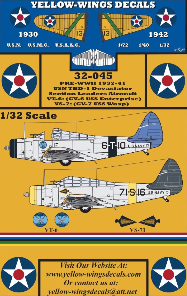 Yellow Wings - 1/32 U.S. Navy Pre-WWII Douglas TBD-1 Devastator, VT-6 Uss Enterprise, VS-71 Uss Wasp