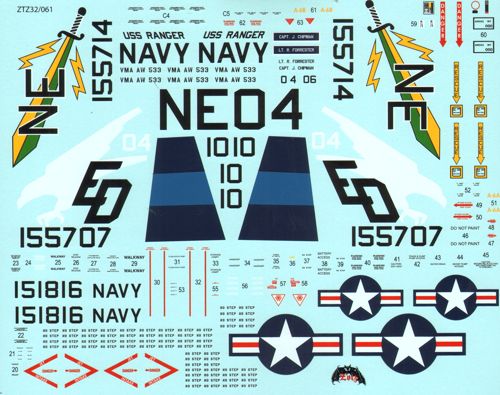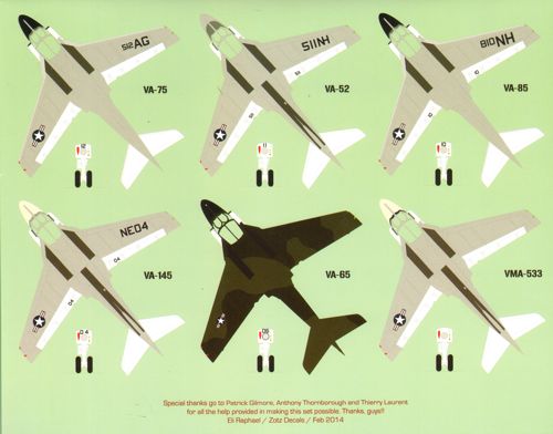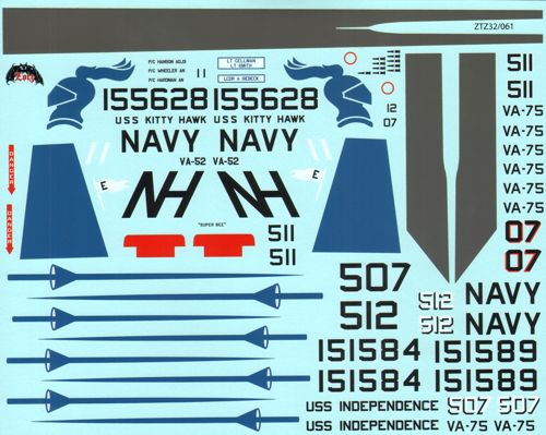 Zotz - 1/32 Grumman A-6A Intruder (9) 151589 AG/512 and 151584 AF/507 VA-75 Sunday Punchers U.S.S. Independence 1965; 151785 NH/805, 151803 NH/810151787 NH/807 all VA-85 Black Falcons U.S.S. Kitty Hawk 1965/66; 155714 NE/504 VA-145 Swordsmen U.S.S. Ranger 11972/73; 155628 NH/51 VA-52 Knightriders U.S.S. Kitty Hawk 1972; 155707 ED/10 VMA(AW)-533 Nighthawks; All Lt Gull Grey/White camo; 151816/406 VA-65 Tigers U.S.S. Constellation 1966 experimental Olive Drab FS34102/Green FS34079 camo.