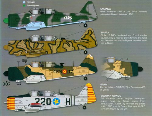 Zotz - 1/32 North-American T-6 'Texan' Congo, T-6G 21 Sqn Force Arianne Congolaise, Central Gov. Force Leopoldville, Congo 1964. Flown in support of Mike Hoareis 5 Commando. Belgium, Harvard III, H-19 flown by Col. Louvignies from Kamina, Belgian Congo 1953-60. Up to 1962 flown from Ruanda-Urundi. Portugal, The FAP was the biggest user of Texans/Harvards for the liberation movements in her African colonies in the early 1960's. All saw considerable action in Angola, Mozambique, and Guinea. In 1975 they finally withdrew from Africa and left those aircraft behind. France, T-6G 51-15033 of EALA 11/72 based at La Reghaia, Algeria 1957. 51-15237 of EALA 5/72 based at Colomb-Bechar, Algeria 1957. 49-2937 of EALA 13/72 based at Paul Cazelles, Algeria, 1957. Katanga, T-6G of Force Arienne Katangaise, Kolwezi, Katanga, 1962. Biafra, Of the twelve T-6G's supplied from French surplus only two reached Biafra forming 42 Sqn, one was captured by Nigeria, the other escaped to Gabon. Spain, Ejercito del Aire C.6 (T-6C/D) of Escuadron 463 at Ganda, Angola. Belgian Congo, T-6 obtained from Belgian examples, mainly flown by Cuban pilots 1962-64, and by mercenary pilots, mostly South Africans, until 1966. H-220 was formally flown by the CIA.