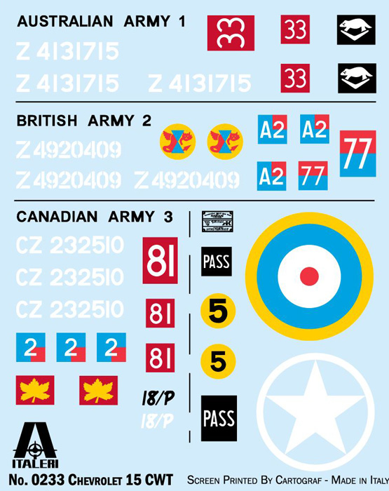 Italeri - 1/35 Chevrolet 15CWT lorry. New Decals Sheet For 3 Versions Colors Instruction SHEET