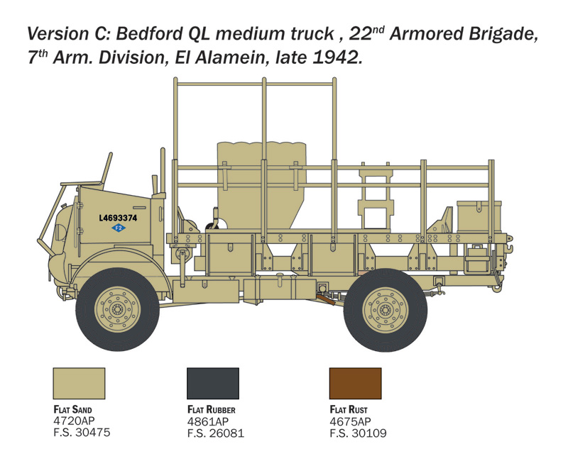 The Bedford Ql line of military trucks was established in the late 1930s for the British Army to have a more modern and flexible transport vehicle. Following the conclusion of testing in 1940 and in early 1941, the Bedford QLs were distributed to Army Corps, Regiments and other Units. For the duration of the war it was deployed on various fronts, proving to be a highly effective support vehicle for meeting both logistical and transportation needs due to its four-wheel drive and relatively low weight which further enhanced its load capacity. With its flexibility and robustness, it was also used for towing and transporting artillery pieces such as the 6 pounder anti-tank gun and the 40mm Bofors anti-aircraft gun. Equipped with a 72 horsepower 6-cylinder petrol engine, it was also notable for its ease of maintenance and repair, an important feature on the battlefield.