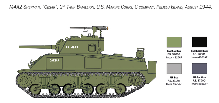 The M4 Sherman medium tank was the primary tank used by the United States during World War II. It has been produced in a significant number of units and it formed the backbone of United Stated armoured forces during at those time. It has been produced in several variants and versions. The first version to be produced on wide scale was the Sherman M4A1 characterised by the rounded edges of the fully casted upper hull. Even the turret had a rounded appearance. However the most important strength of the tank was its project. The Sherman was reliable, cheap and easy to produce in great numbers. The M4A2 version was similar to the previous one but it was Diesel-powered with General Motors Twin G-41 Engine. At the beginning the M4A2 was dedicated to support the war activities of allied nations as Soviet Union and Great Britain but a lot of tanks were used by the United States Marine Corps. Actively used in the battles for the reconquest of the archipelagos of Pacific Ocean, they played a fundamental role in the destruction of the powerful fortifications built by the Japanese Army.