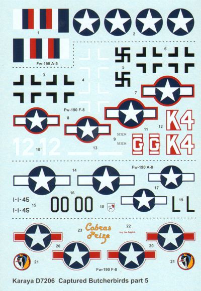 Karaya - 1/48 Scale Colourful Captured Butcherbirds Part 5 (4) Focke-Wulf Fw 190A-5 captured by 325th Gf and painted blue fuselage and top of wing, grey underwing with red nose and yellow fuselage band; Focke-Wulf Fw 190F-8 K4-G captured by 511th FS/404th Fg not overpainted; Focke-Wulf Fw 190A-8 Captured at St.TRond Ab Belgium 1/1/45 by 404th Fg flown by Col.Leo Moon, overall bright red with code OO-L; Focke-Wulf Fw 190F-8 captured by 354th Fg Jan 45 flown by Maj Jim Dalglish. Overall yellow with red nose and trim.