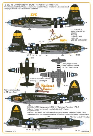 Kits-World - 1/144 B-26C-45-MO Marauder 42-107841 "Little Pink Panties" TA-6, 391BG 573BS France Jan 1945 B-26B-15-MA Marauder 41 31608 "Our Baby" AN-Q, 386BG 553BS Great Dunmow 1944 - B-26C-15-MO Marauder 41-34946 "The Yankee Guerrilla" YA-L, 386BG 555BS Boxted, August 1943 - B-26B-45-MA Marauder 42-95812 "Rationed Passion" P2-D, 391BG 572BS Matching, Essex 1944