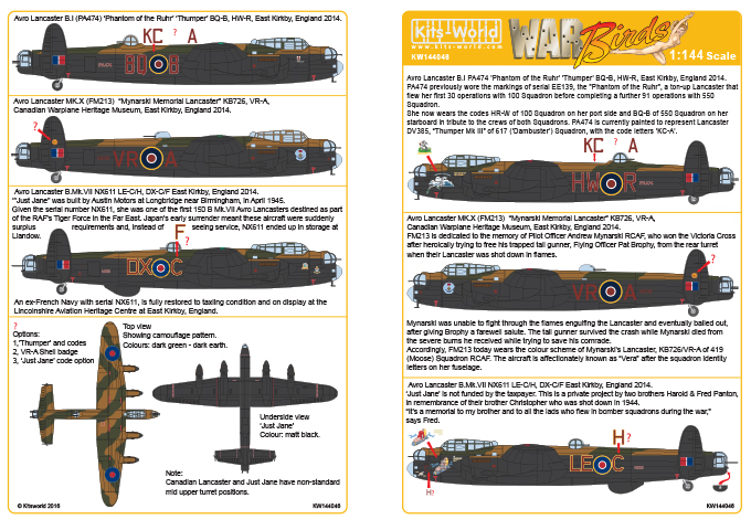 Kits-World - 1/144 Avro Lancaster B.Mk VII, NX611, LE-C/H DX-C/F Lincolnshire Aviation Heritage Centre,East Kirby England, 2014. Avro Lancaster B.Mk.X, KB726 VR-A, 419 (Moose) Sqn, RCAF Canadian Warplane Hertiage Museum, 2014. Avro Lancaster B.MkI, PA474 KC-A 'BBMF DV385 Thumper III' England 2014.