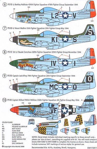 Kits-World - 1/72 North-American P-51D Mustang Nose Art, Kill Markings, Nose Checks Pt 1. 'Shillelagh', Happy Jack's Go Buggy', 'Red Dog XII', 'Pin Up Girl' 'Heat Wave', 'Ridge Runner', 'Missouri Mauler', Individual aircraft markings only.
