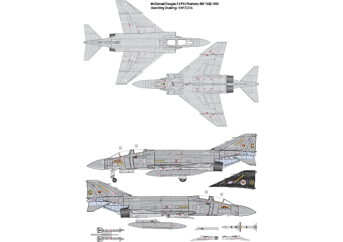 Kits-World - 1/72 This sheet includes markings to complete any four of the fifteen McDonnell F4J Phantoms purchased by the Raf as stand-ins for the still in development Fighter Variant of the Panavia Tornado F.2/F.3. The J was used by No74 Tiger Squadron and served for almost 10 years until replaced by the Tornado ADV. The F4J was a direct purchase of former US aircraft with no provision for standard Raf equipment so flight crew had to use Usaaf flying gear compatible with the Aces ejection seats fitted to the aircraft. The F4J also came with the J79 Turbojet, notice the long, vaned exhaust and slimmer intakes which were modified by the British when the Rolls Royce Spey was fitted. The decal sheet comes with a full suite of stencilling data although not all stencilling was present on every aircraft, it is recommended you check with your reference as to broadly what was used on the aircraft you wish to depict. Also, a few flight crew names are included but these, of course, would have changed over the career of each aircraft.