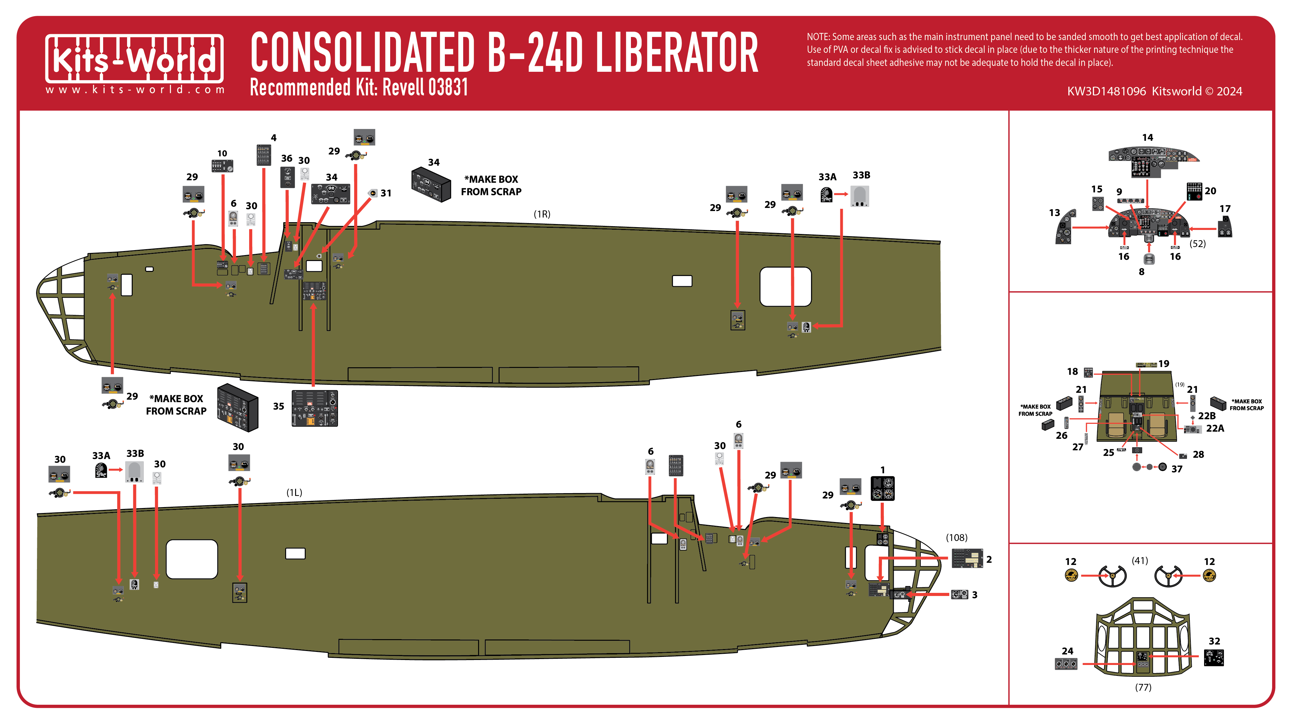 Kits-World - 1/48 Consolidated B-24D Liberator cockpit interior detail set for Revell