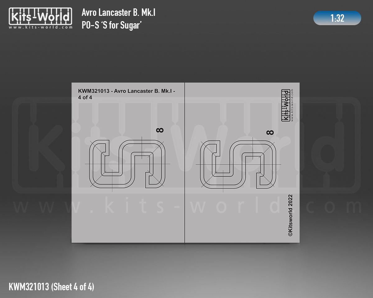 Kits-World - 1/32 Avro Lancaster B.I/III PO-S, S for Sugar, R5868 5 sheet stencil scheme set including the decal sheet.