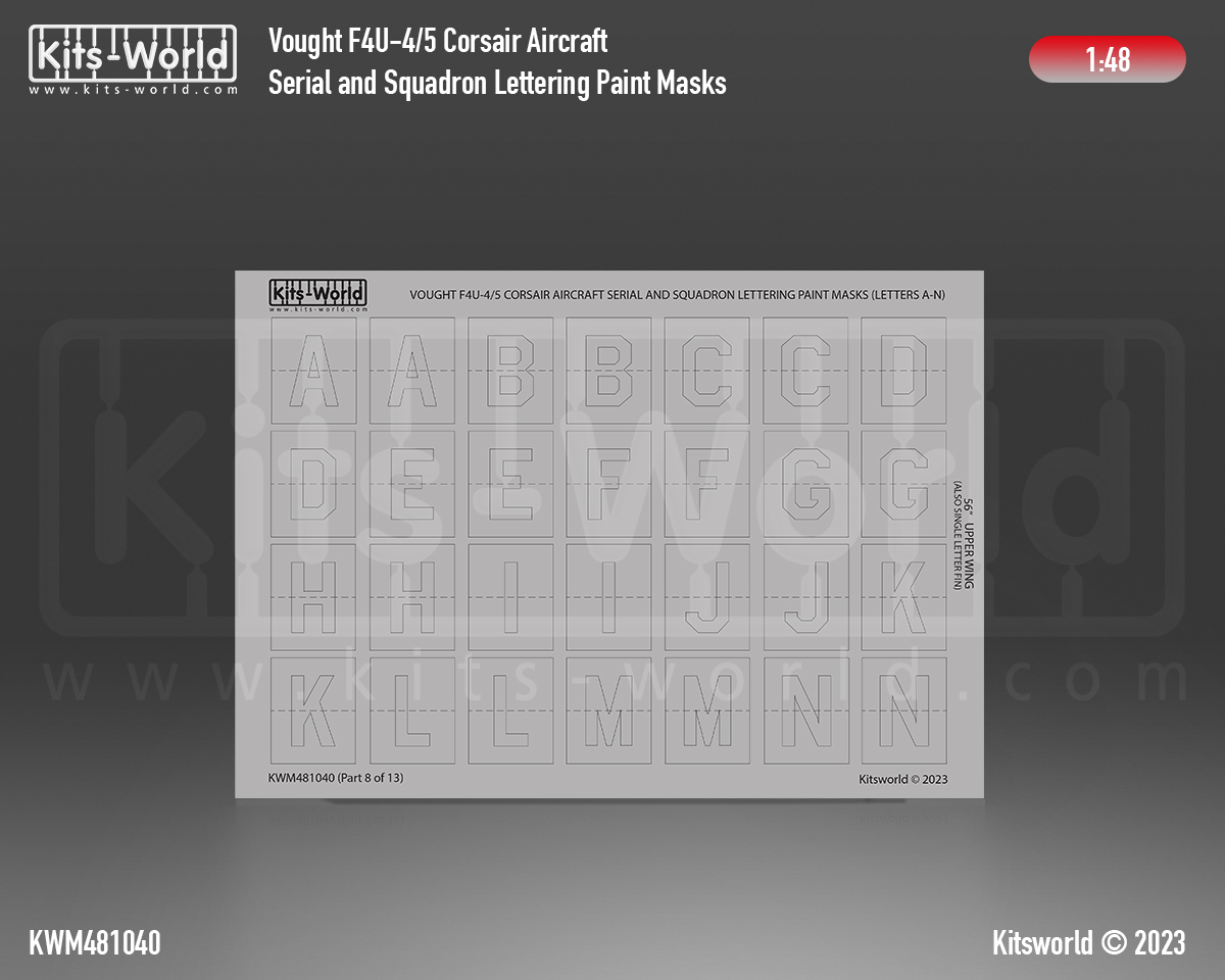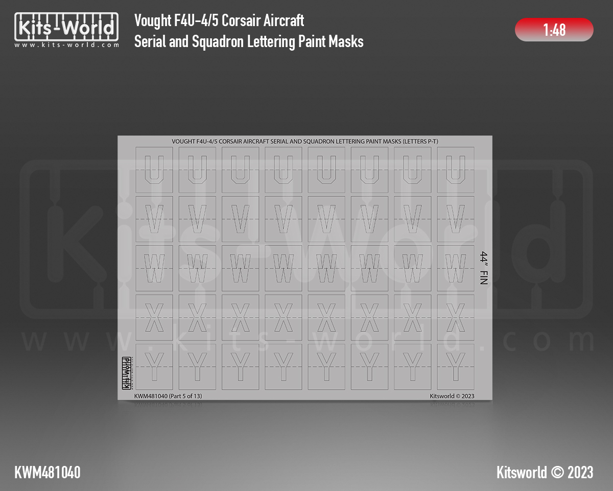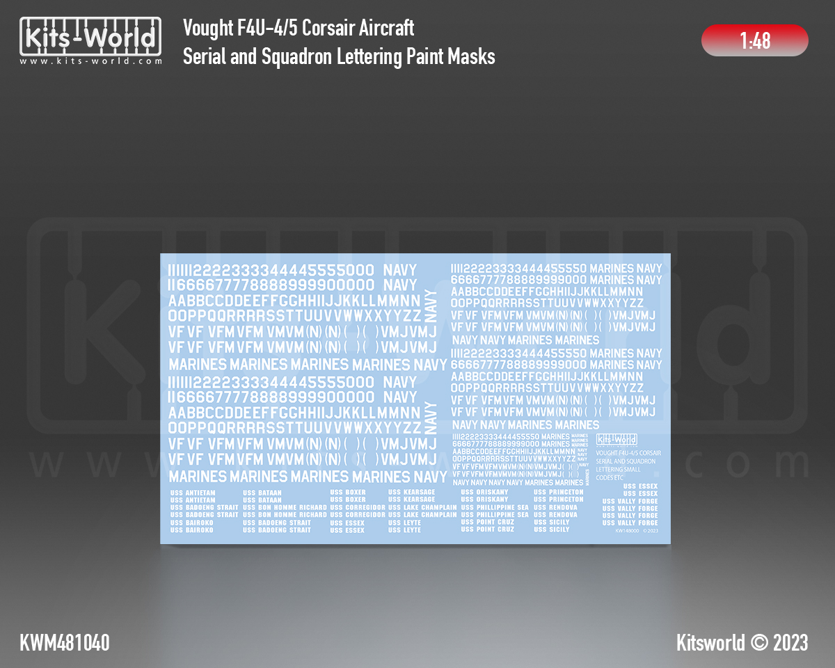 Kits-World - 1/48 Vought F4U-4/5 Corsair Serial and Squadron Lettering Paint Mask (14 piece set including decal sheet).