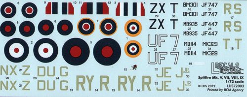 Ldecals Studio - 1/72 Spitfire Mk.Vb, VII, VIII and IXe - Mk.Vb RY-R BM301 323 ( Czech) Sqn Hornchurch 1942; RS-T Wg/Cdr Stanford Tuck Biggin Hill 1942; HF.VII MB935 NX-Z 131 Sqn RAF Harrowbeer 1944; MD114 DU-G 312(Czech) Sqn Orkney 1944; Mk.VIII JF747 ZX-T 145 Sqn; JF447 UF-7 601 County of London Sqn 1943, both in Desert camo; Mk.IX MK329 JE-J 144(RCAF) SqnWg/Cdr Johnie Johnson 1944