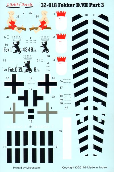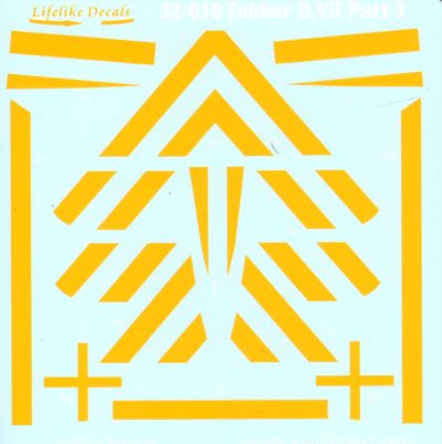 Lifelike - 1/32 Fokker D.VII's. Fokker D. VIIF, 4348/18 of Jasta Boelcke, November 1918. Fokker D.VII (OAW), 4499/18, flown by Vizeflugmeister Franz Mayer, MFJ III, August/September 1918. Fokker D. VIIF, 323/18F, flown by Vizefeldwebel Willy Gabriel, Jasta 11, late June 1918. Fokker D. VII (OAW), 2188/18 (?), flown by Ltn. Hans Koerner, Jasta 19, early 1918 to September 1918.