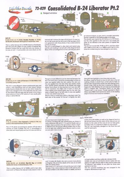 Lifelike - 1/72 Consolidated B-24 Liberator A/C #1--B-24H-15-CF, "Double Trouble", "4Z-H+ "of 8AF/467BG/791BS A/C #2--B-24D-CO, "Lil' De-Icer", "I" of 9AF/98BG/415BS A/C #3--F-7A, "Over Exposed", "2-I" of 311PW/2PMS A/C #4--B-24J-185-CO, "Shy-Chi Baby" of 5AF/380BG/531BS