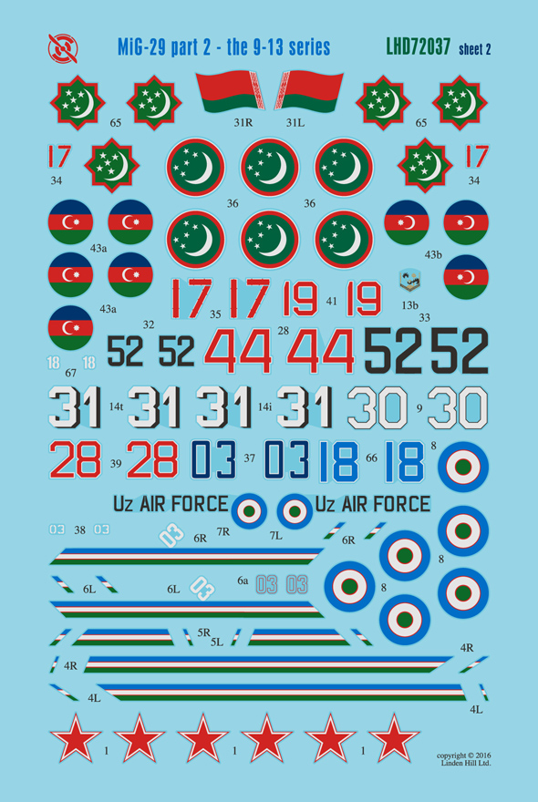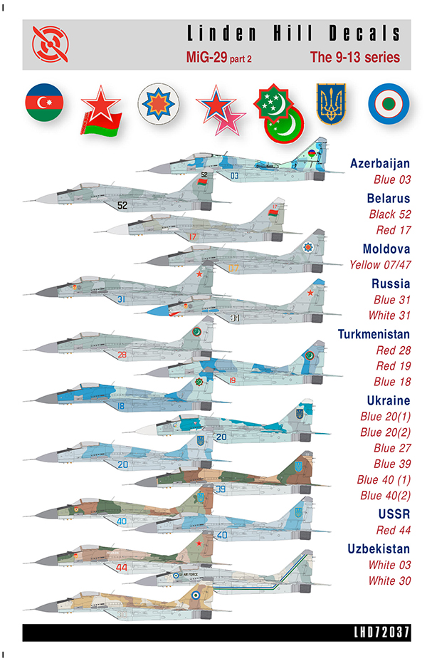 Linden Hill - 1/72 'MiG-29 9-13' (18 MiG-29 9-13s from Azerbaijan, Belarus, Moldova, Russia, Turkmenistan, Ukraine, USSR and Uzbekistan for the new Zvezda and Trumpeter MiG-29 9-13 kits)