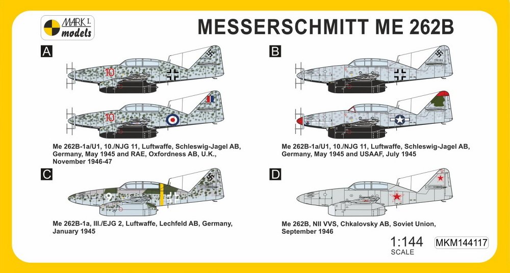 Mark I Models - 1/144Messerschmitt Me-262B Night Fighter (2in1 = 2 kits in 1 box) (Luftwaffe, RAF, USAAF, Soviet AF)