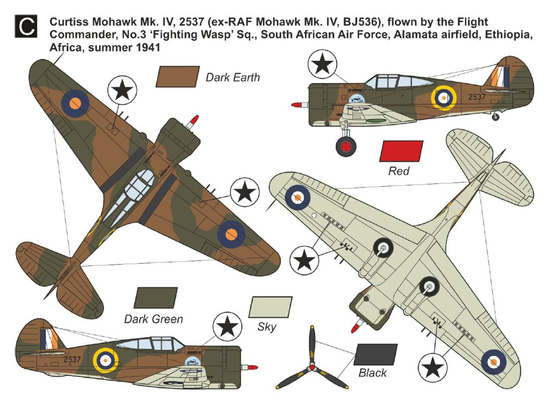 3 Curtiss Mohawk Mk. IV, 2537 ex-RAF Mohawk Mk. IV, BJ536, flown by the Flight Commander, No.3 Fighting Wasp Sq., South African Air Force, Alamata airfield, Ethiopia, Africa, summer 1941
