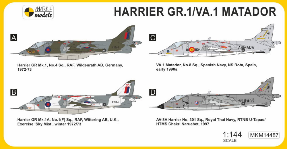 Mark I Models - 1/144 BAe Harrier GR.1/VA.1 Matador The Hawker Siddeley Harrier ?Jump Jet? is a British V/STOL aeroplane developed in the 1960s. The initial version, the Harrier GR.1, was based on the P.1127 (RAF) fighter and the first aircraft of a total of sixty for the Raf were delivered in the spring of 1969. The GR.1A was an upgraded version of the GR.1 having an uprated powerplant. 58 aircraft of this model existed, of which 17 were new built and 41 modified from the GR.1. During the type?s service the Raf operated the Harrier fleet in West Germany as a deterrent against Warsaw Pact threat.