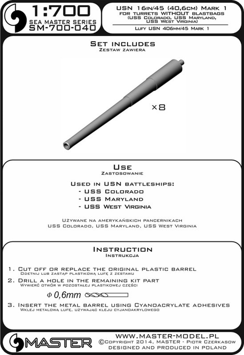 MASTER (PL) - 1/700 USN 40,6cm Mark 1 barrels w/o blastbags (8x)