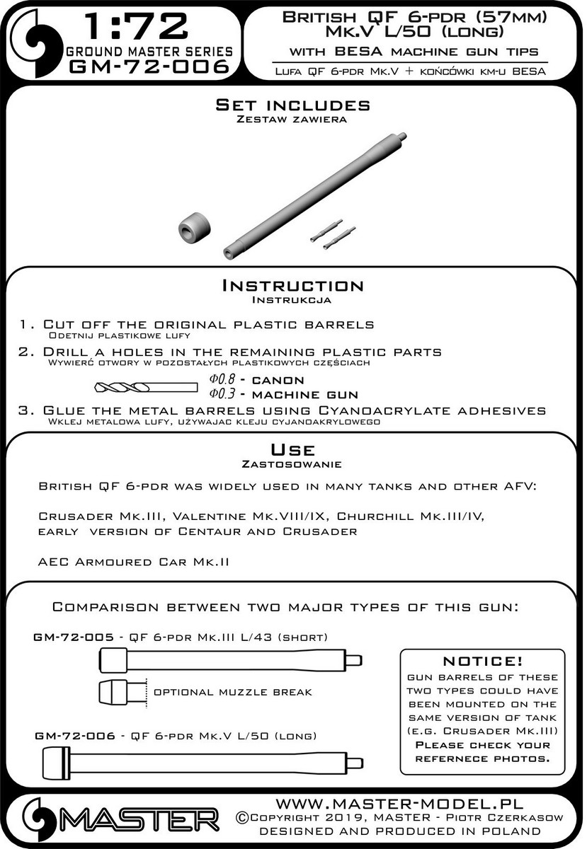 Master (PL) - 1/72 British Qf 6-pdr (57mm) version Mk.V L/50 (long) + Besa Mg tips for Crusader Mk.III, Churchill Mk.III/IV, Valentine Mk.VIII/IX (for Ibg kits)