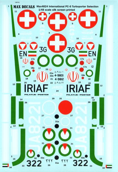 Max - 1/48 International Pilatus Turbo Porter selection. Switzerland, Austria, Iran, Dubai and Japan. For use with Roden