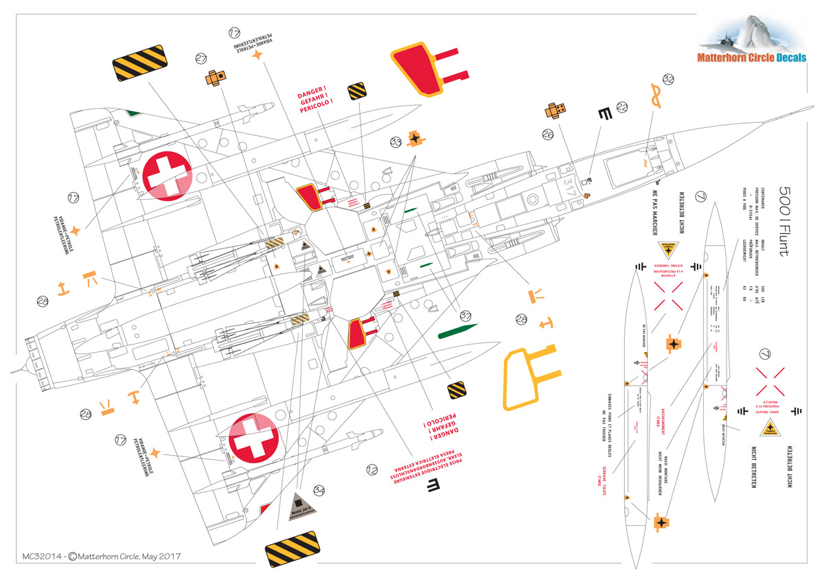 Matterhorn Circle - 1/32 Swiss Dassault Mirage IIIC, IIIS, IIIRS Stencils & Maintenance Markings.