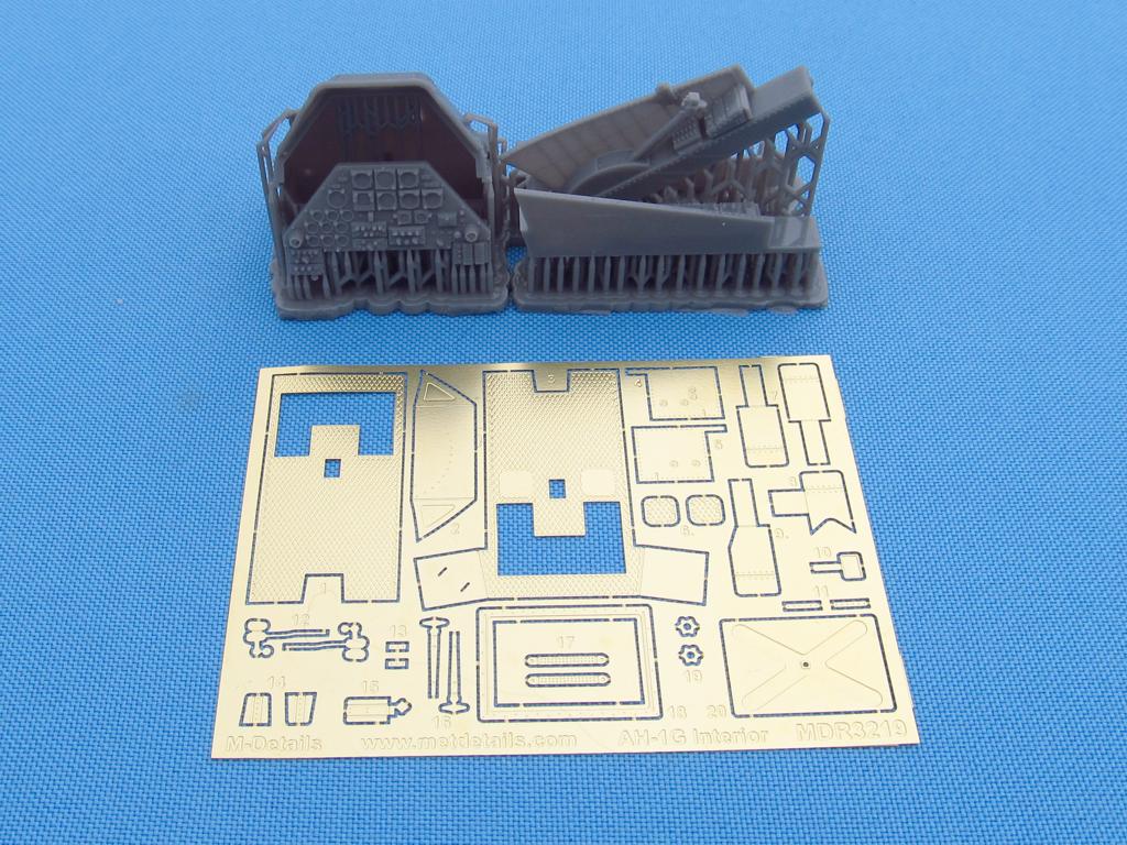 Set contains photoetched, 3D-printed and self-adhesive parts for interior detailing for the Bell AH-1G Cobra helicopter model by Icm in scale 1/32.