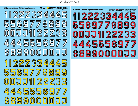 Microscale - 1/48 West German Luftwaffe Fighter Code Numbers -White, Red & Yellow numbers with Black Outlines - 2 Sheet Set (White Filll)