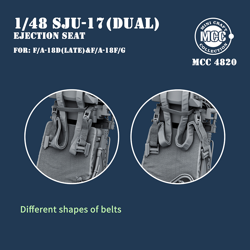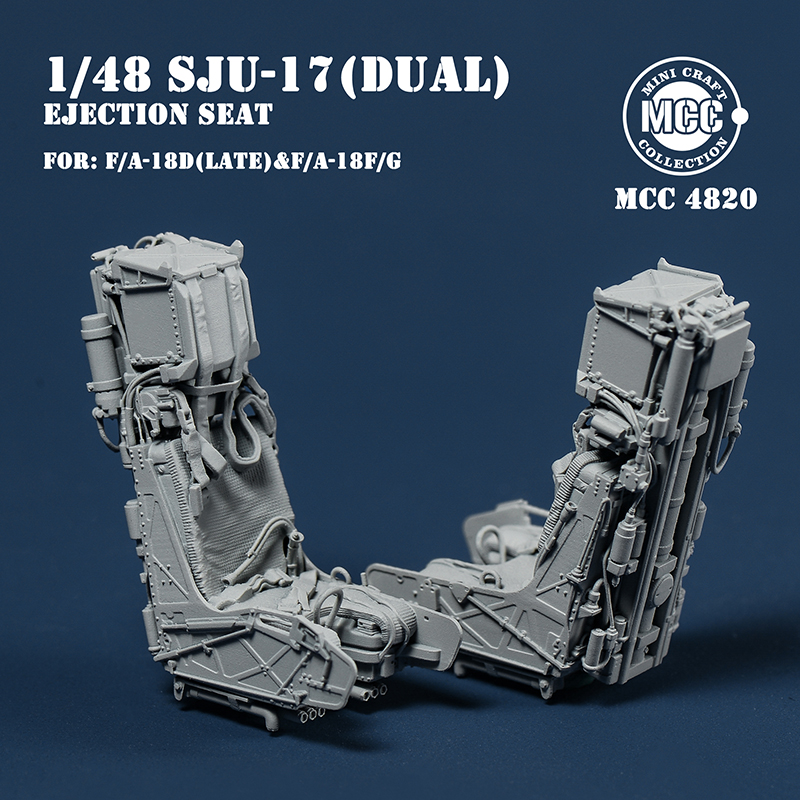 Mini Craft Collection - 1/48 SJU-17 Naces Ejection Seats for Boeing F/A-18F/G & F/A-18D Late 2pcs. 1 pcs SJU-17V2/A Front Seat and 1 pcs SJU-17V9/A Rear Seat Naces Ejection Seats for F/A-18F Super Hornet, EA-18G Growler, F/A-18D Hornet Late version, Front and rear seats have different details and seats belt styles. All parts are 3D-printed. Fits all brands