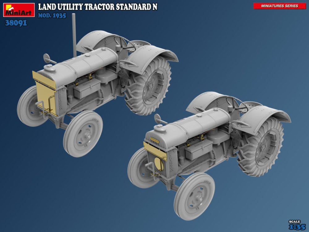 MiniArt - 1/35 Land utility tractor standard n mod. 1935 this model represents the tractor that plowed the fields all week and when war came, towed trailers, generators, and bomb trolleys for the allies. this kit recreates the tractor's heavy pressed-steel build, exposed four-cylinder engine, and signature wheels, making it a perfect slice of civilian or behind-the-lines life for any 1:35 display.highly detailed plastic molded partsphoto-etched parts included for extra realismclear parts for head- and work-lamp lensesdecal sheet with three markings