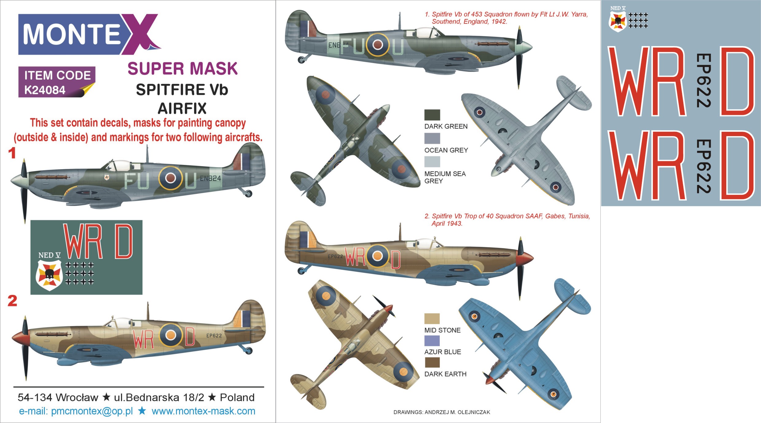 Montex - 1/24 Supermarine Spitfire Mk.Vb 2 canopy mask (outside & inside) + 3 insignia masks + decals