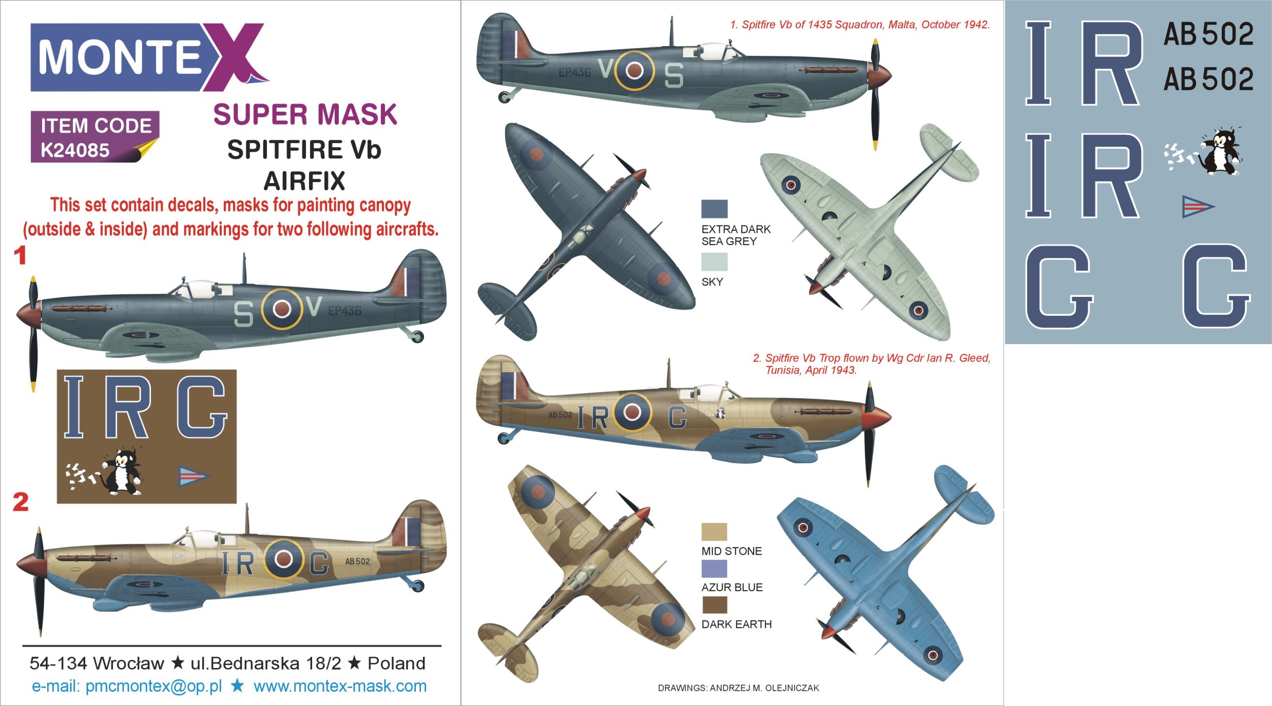 Montex - 1/24 Supermarine Spitfire Mk.Vb 2 canopy mask (outside & inside) + 3 insignia masks + decals (for Airfix kits)
