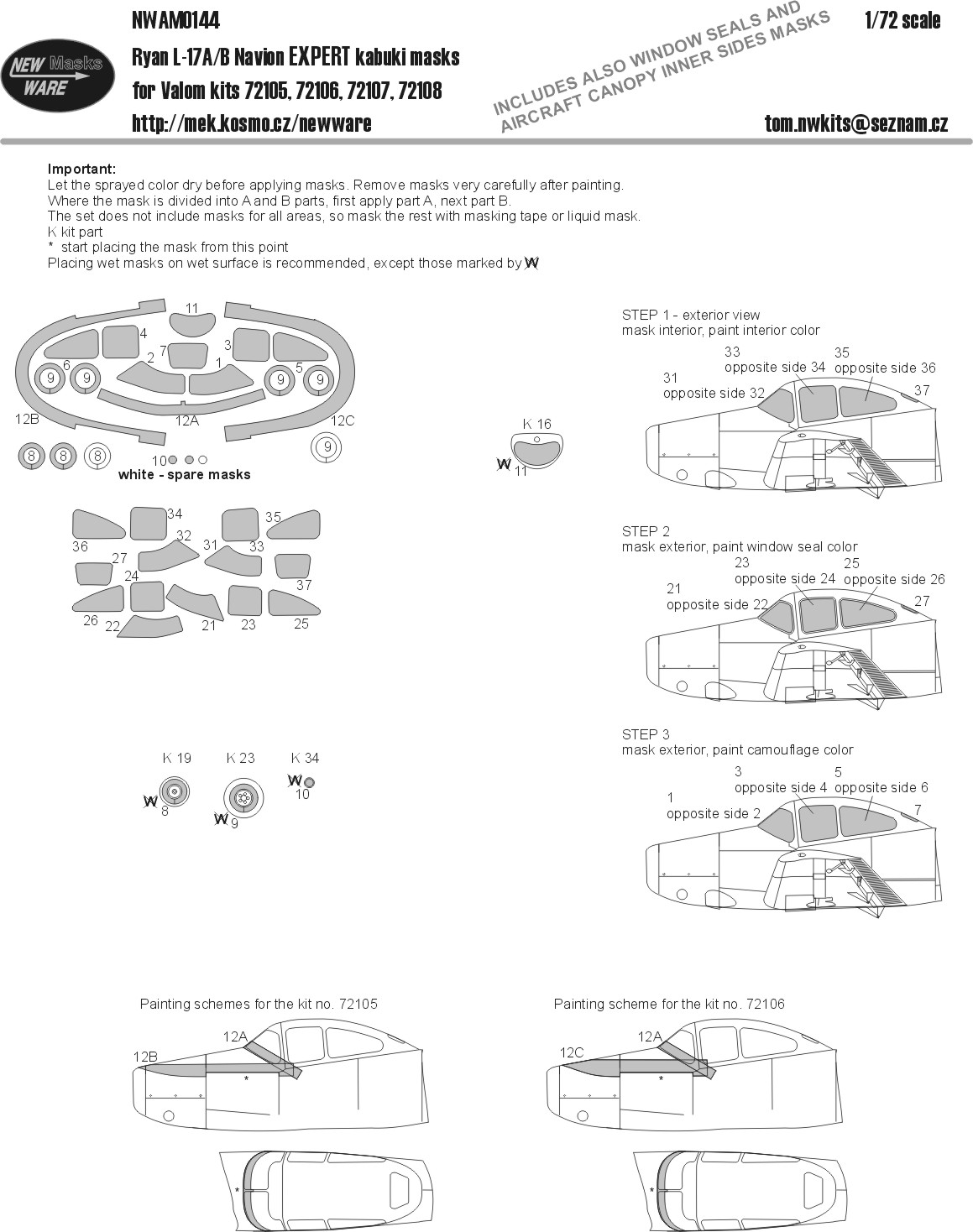 New Ware - 1/72 Mask Ryan L-17A/B Navion EXPERT for aircraft canopy including window seals and inner sides of windows, wheels, nose, black antireflex area in the front of the aircraft canopy (for Valom kits)