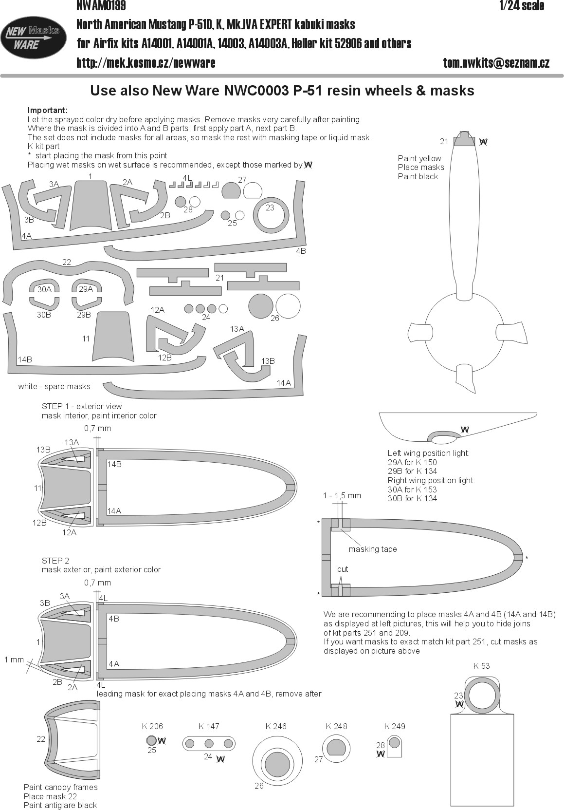 New Ware - 1/24 North-American P-51D, P-51K, Mk.IVA Mustang EXPERT kabuki masks (for Airfix and heller kits) aircraft canopy including inner sides, other clear parts, position lights, antiglare shield, propeller