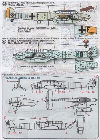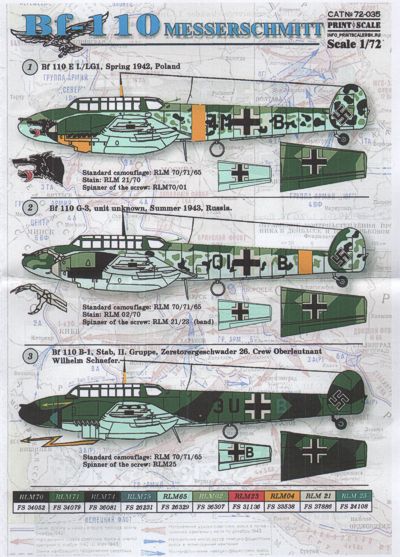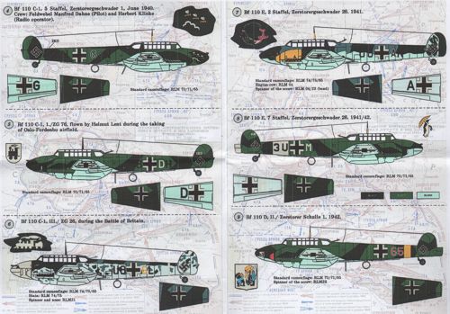 Print Scale - 1/72 Messerschmitt Bf 110 - 110B 3U+BC Stab II; 110C 2N+GN June 1940; U8+GL III/ZG 26 B of B; 110D Red 65 ZG Schulle 1 1942; 110E U8+AK ZG 26 1941; 3U+MR ZG 26 1941; 4M+KB 1./LG1 Wolf on nose Poland 1942; 110G OI+VB Russia 1943; 110F LN+FR 10(E)Staffel ZG 5; WD NZG 1 1944.