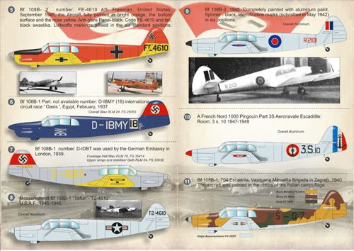 5. Bf 108B- 2 number: FE-4610 Afb Freeman, United States, September 1945, the Aircraft fully painted in bright orange, the bottom surface and the nose yellow. Anti-glare Panel-black. Code FE-4610 and tail, black swastika. Luftwaffe markings affixed in the six standard positions.
