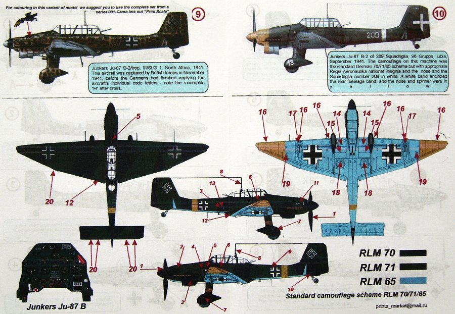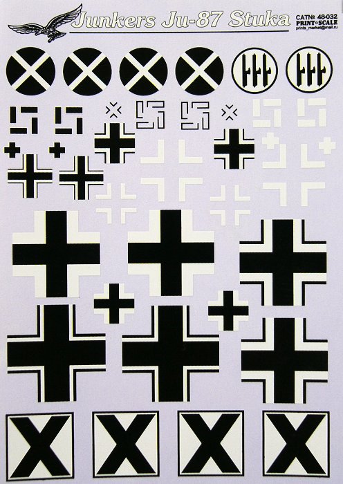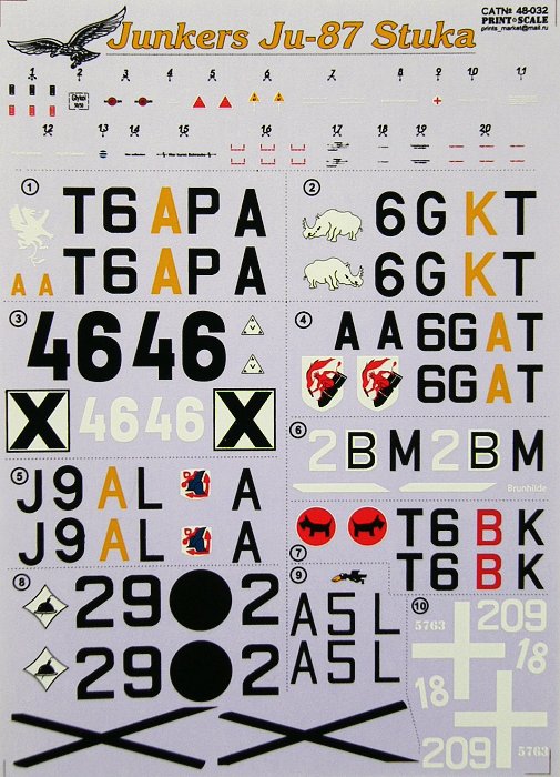 Print Scale - 1/48 Junkers Ju-87A/Ju-87B-1/Ju-87D/Ju-87G 'Stuka' (10) Several camouflage schemes including Spanish Civil War, RLM70/71/65, Soviet Winter, Nth Africa, a wide variety of Squadron makings, Italian Air Force Libya 1941. Double sheet.