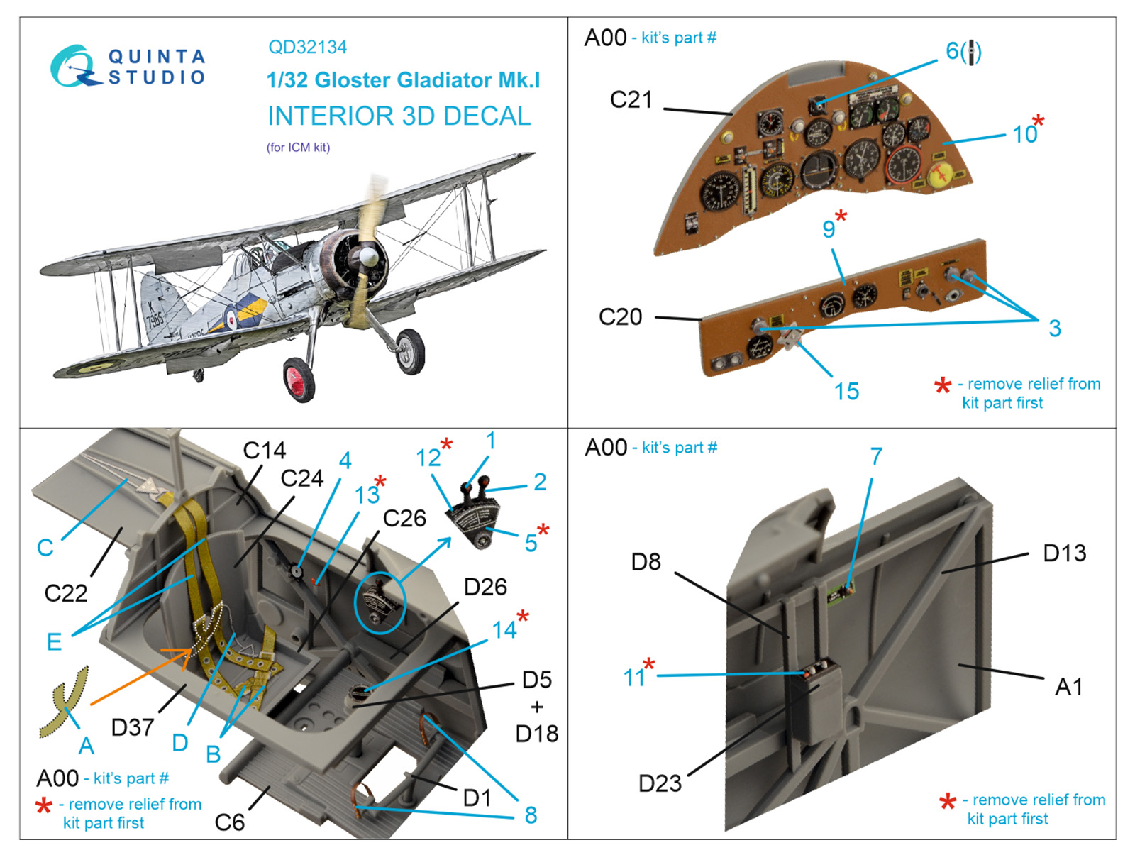 Quinta Studio - 1/32 Gloster Gladiator Mk.I 3D-Printed & coloured Interior on decal paper (for Icm kits)