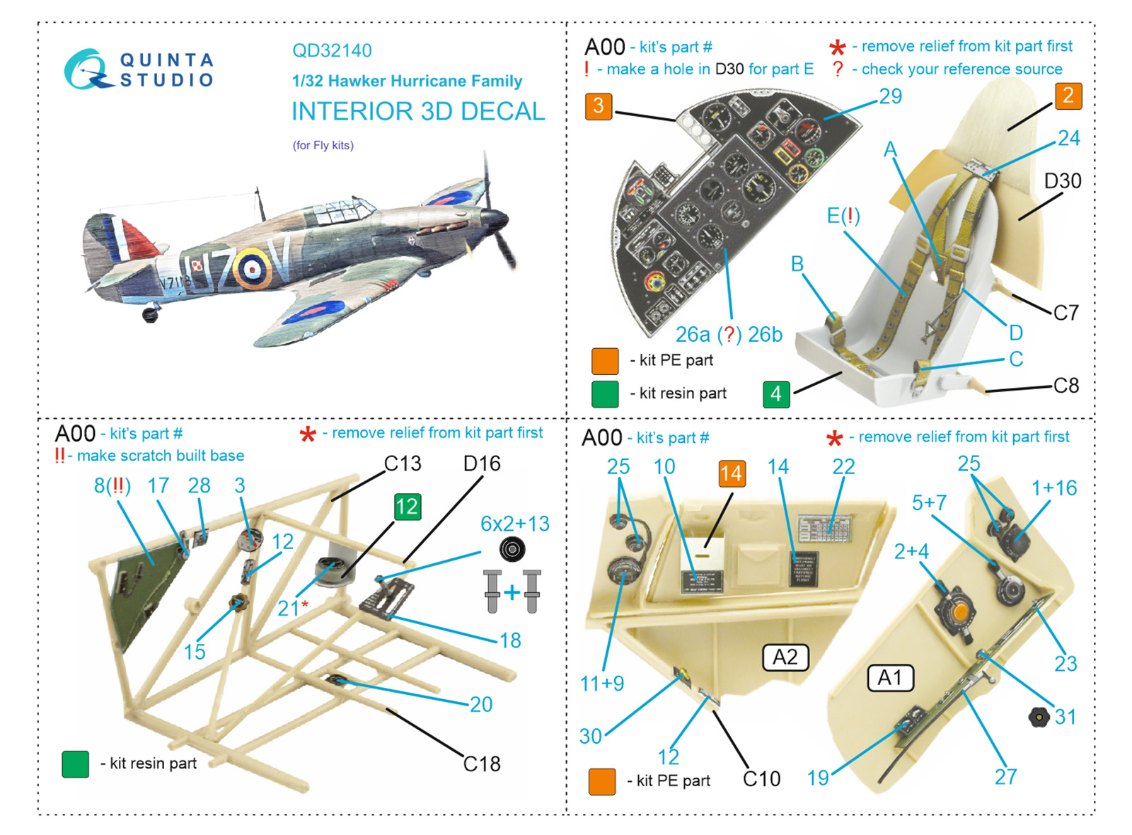 Quinta Studio - 1/32 Hawker Hurricane Family 3D-Printed & coloured Interior on decal paper (for Fly kits)
