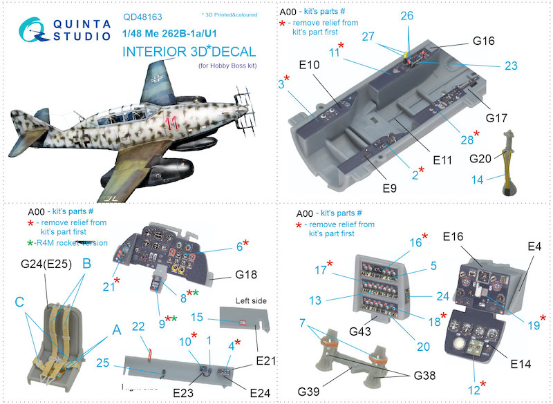 Quinta Studio - 1/48 Messerschmitt Me-262B-1a/U1 3D-Printed & coloured Interior on decal paper (for Hobby Boss kits)