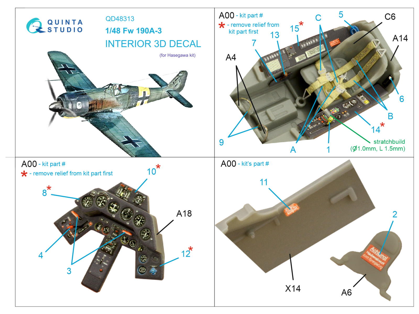 Quinta Studio - 1/48 Focke-Wulf Fw-190A-3 3D-Printed & coloured Interior on decal paper for Hasegawa