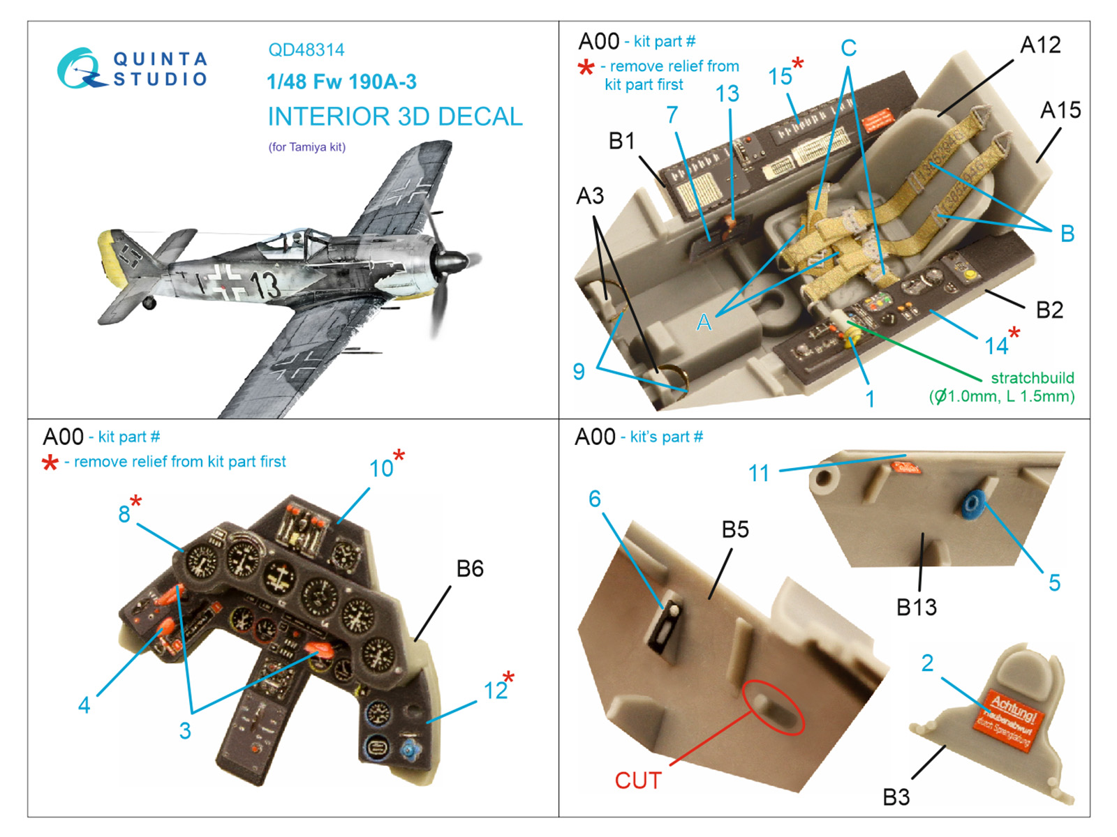 Quinta Studio - 1/48 Focke-Wulf Fw-190A-3 3D-Printed & coloured Interior on decal paper for Tamiya