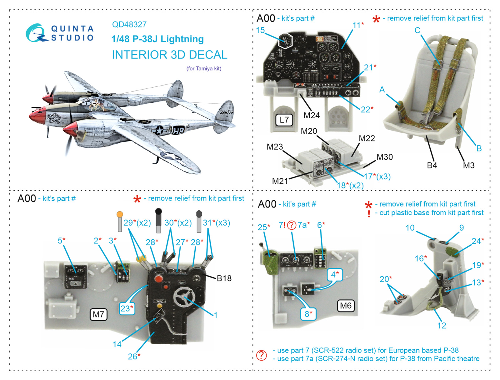 Quinta Studio - 1/48 Lockheed P-38J Lightning 3D-Printed & coloured Interior on decal paper (for Tamiya kits)