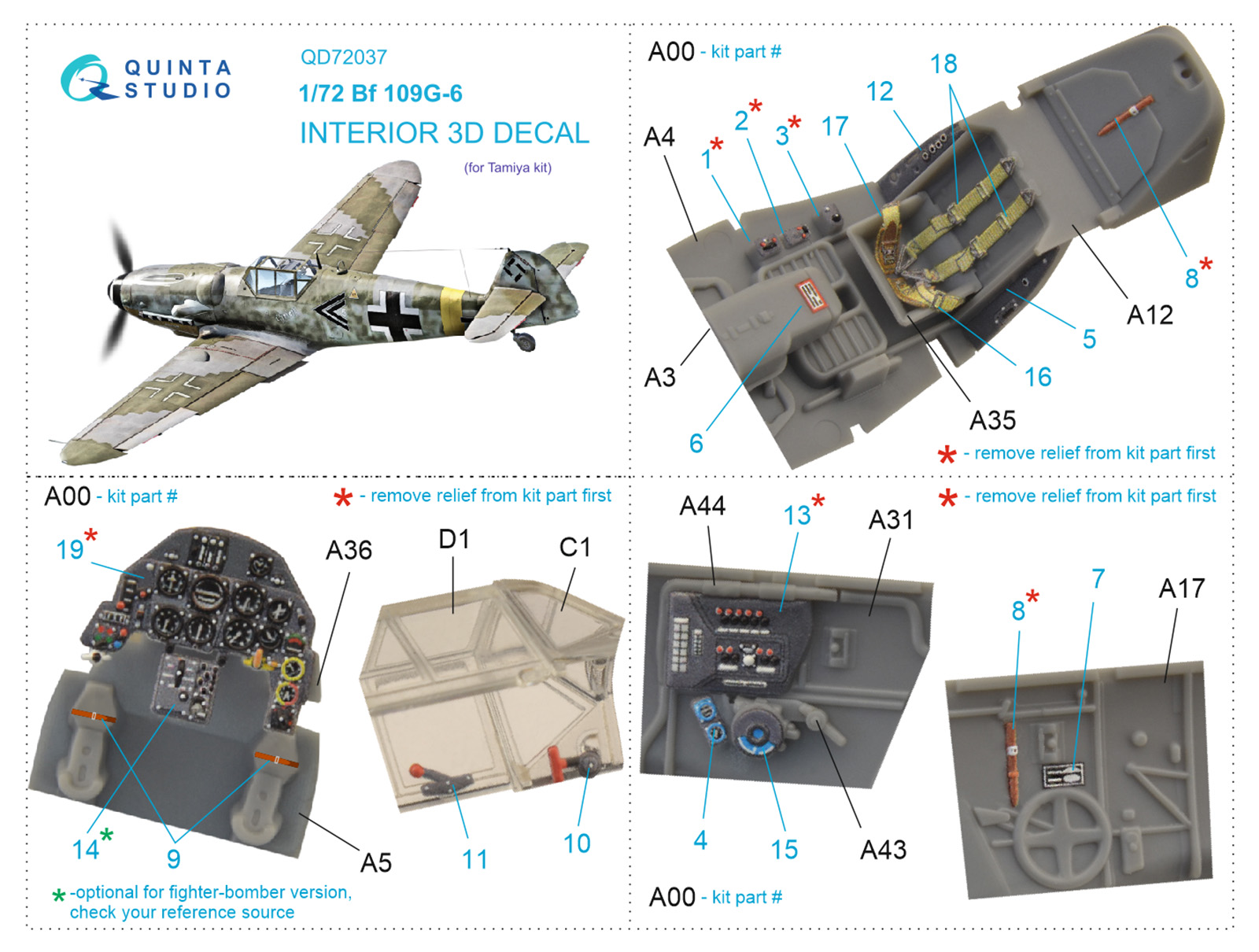 Quinta Studio - 1/72 Messerschmitt Bf-109G-6 3D-Printed & coloured Interior on decal paper (for Tamiya kits)