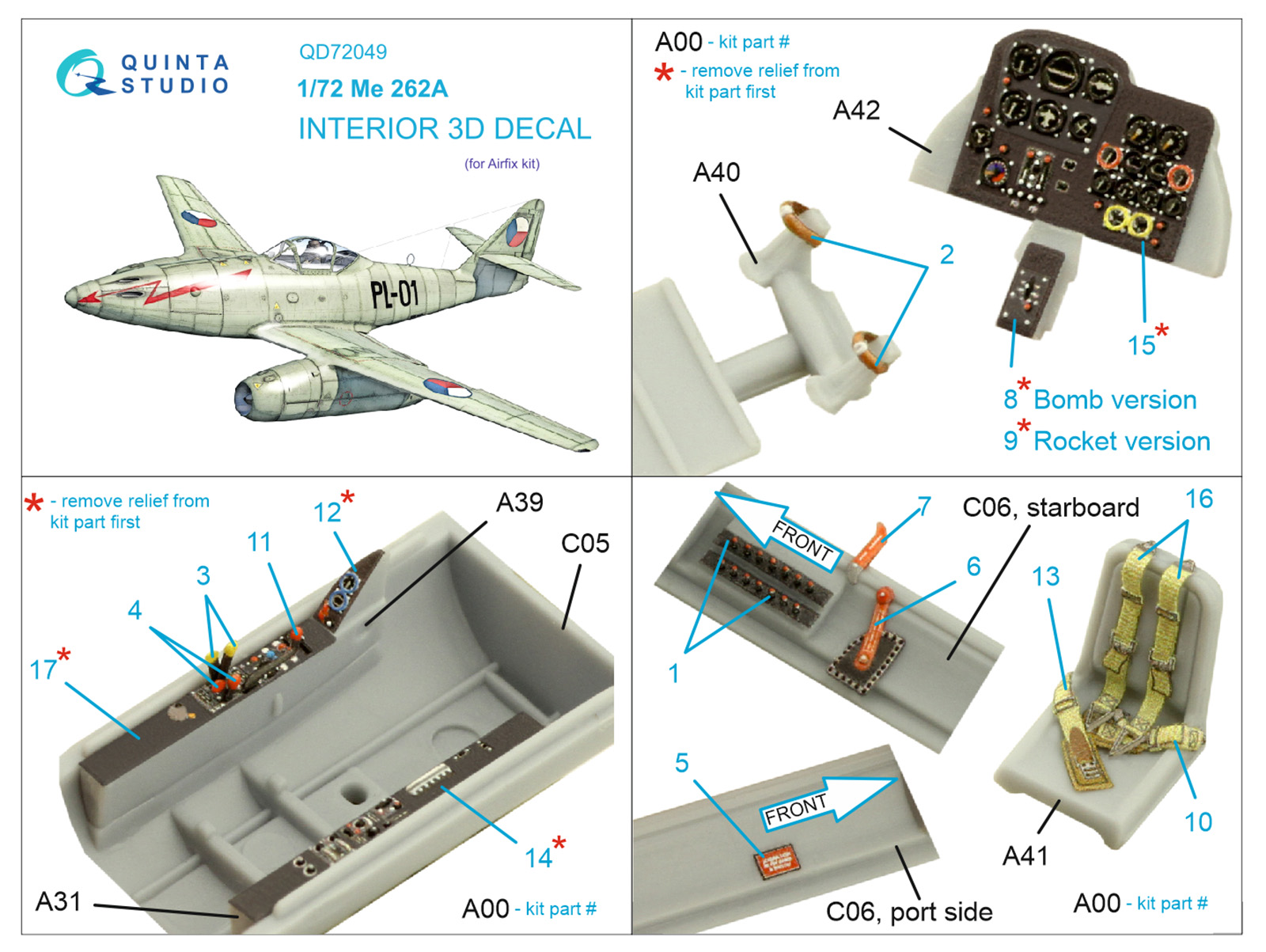 Quinta Studio - 1/72 Messerschmitt Me-262A-2A 3D-Printed & coloured Interior on decal paper (for Airfix kits)