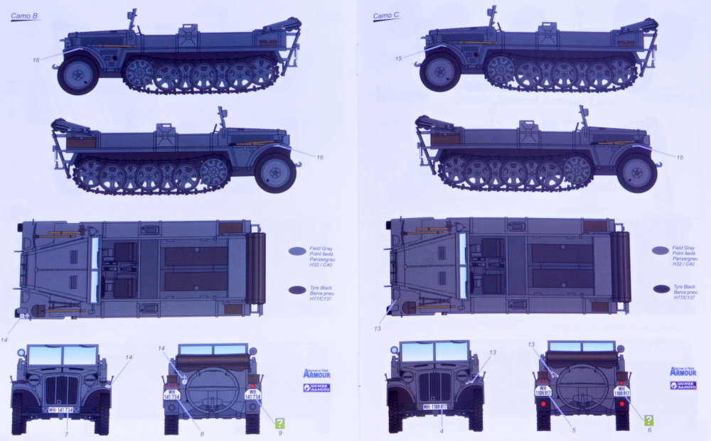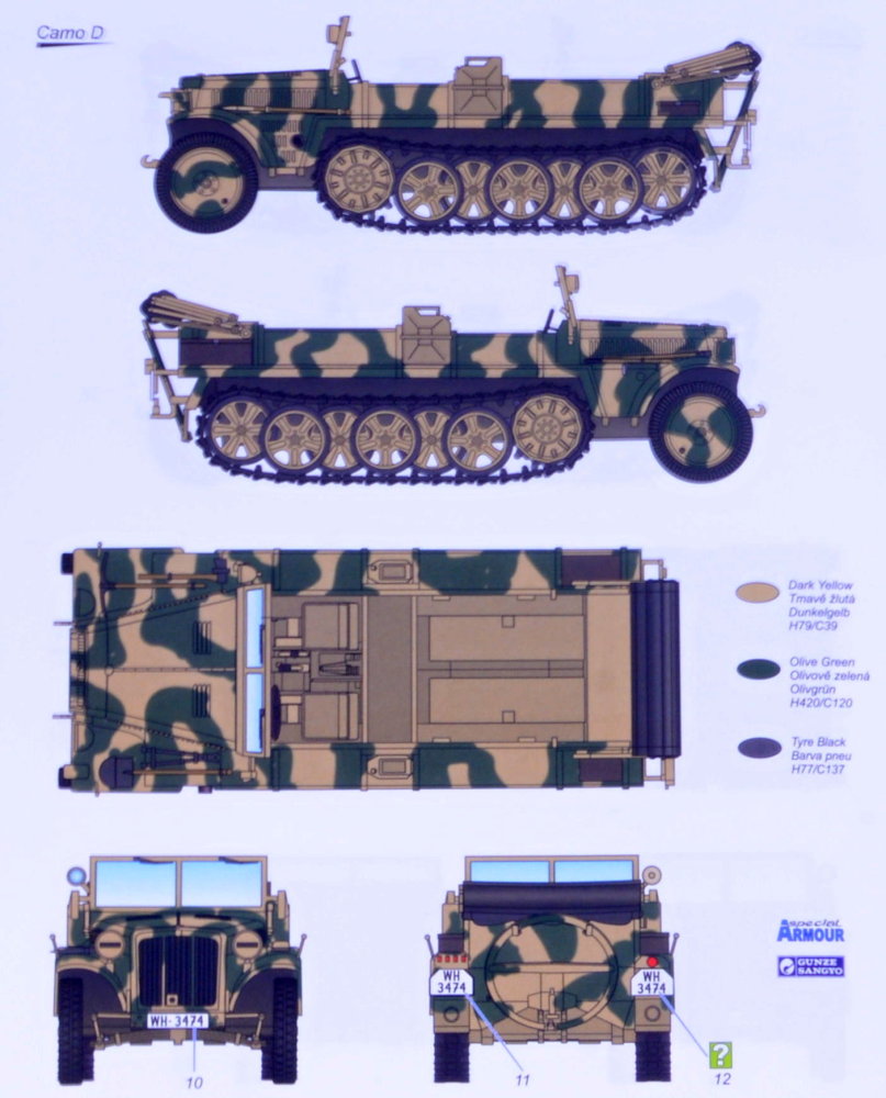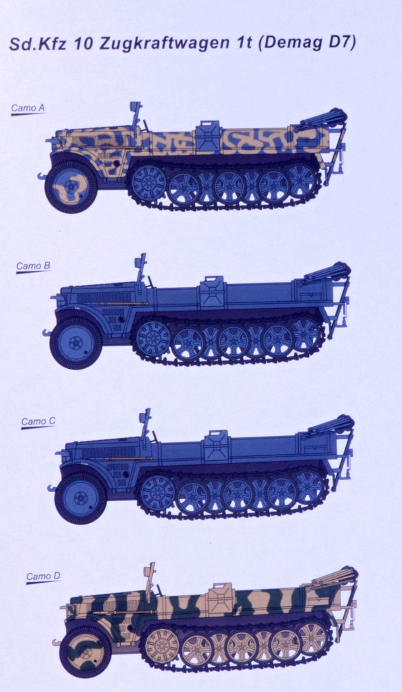 The Sd.Kfz. 10 was a multi-purpose half-track military vehicle used for carrying troops and other tasks. The basic version Sd.Kfz.10 could also tow lighter artillery weapons such as anti-tank or anti- aircraft guns or Nebelwerfer rocket launchers. During the production, more powerful tow system was installed which enabled towing anti-tank cannons of up to 75mm bore or even the sIG 33 heavy infantry gun. The Sd.Kfz.10 saw service throughout the duration of the war, from the attack on Poland until the capitulation in May 1945. The decal sheet in the kit brings markings for two grey-coloured and two camouflaged machines.